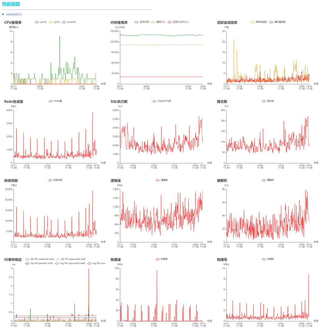 性能视图是ankole巡检报告中最具特色的内容,在巡检报告中展示出巡检数据库所有实例和主机的相关性能指标曲线图,包括: