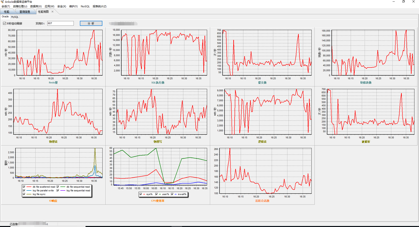 从这里,有经验的DBA就可以看出,ankole数据库运维平台将AWR性能快照收集起来了,通过相关指标项的折线图就可以快速了解数据库的性能历史。